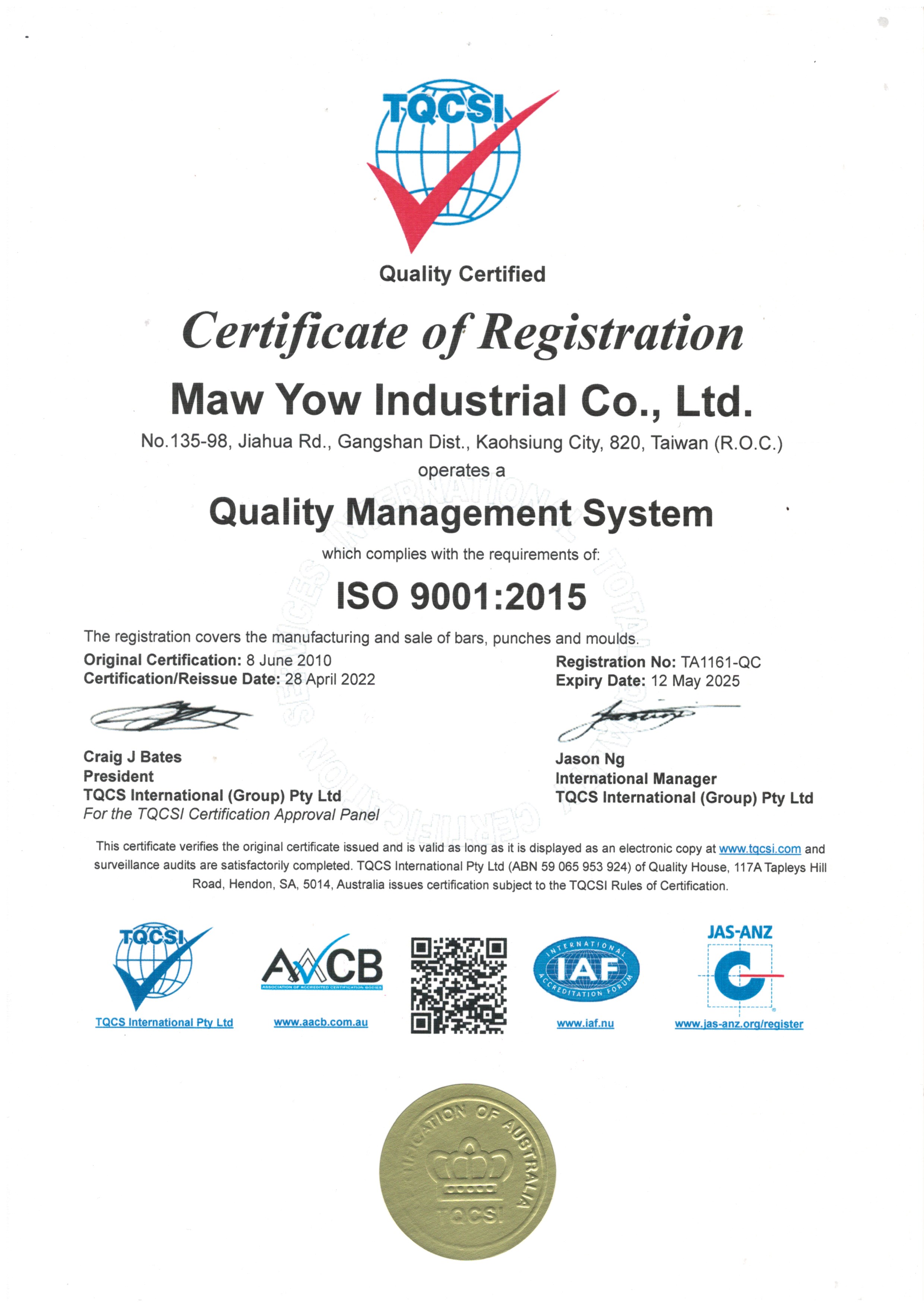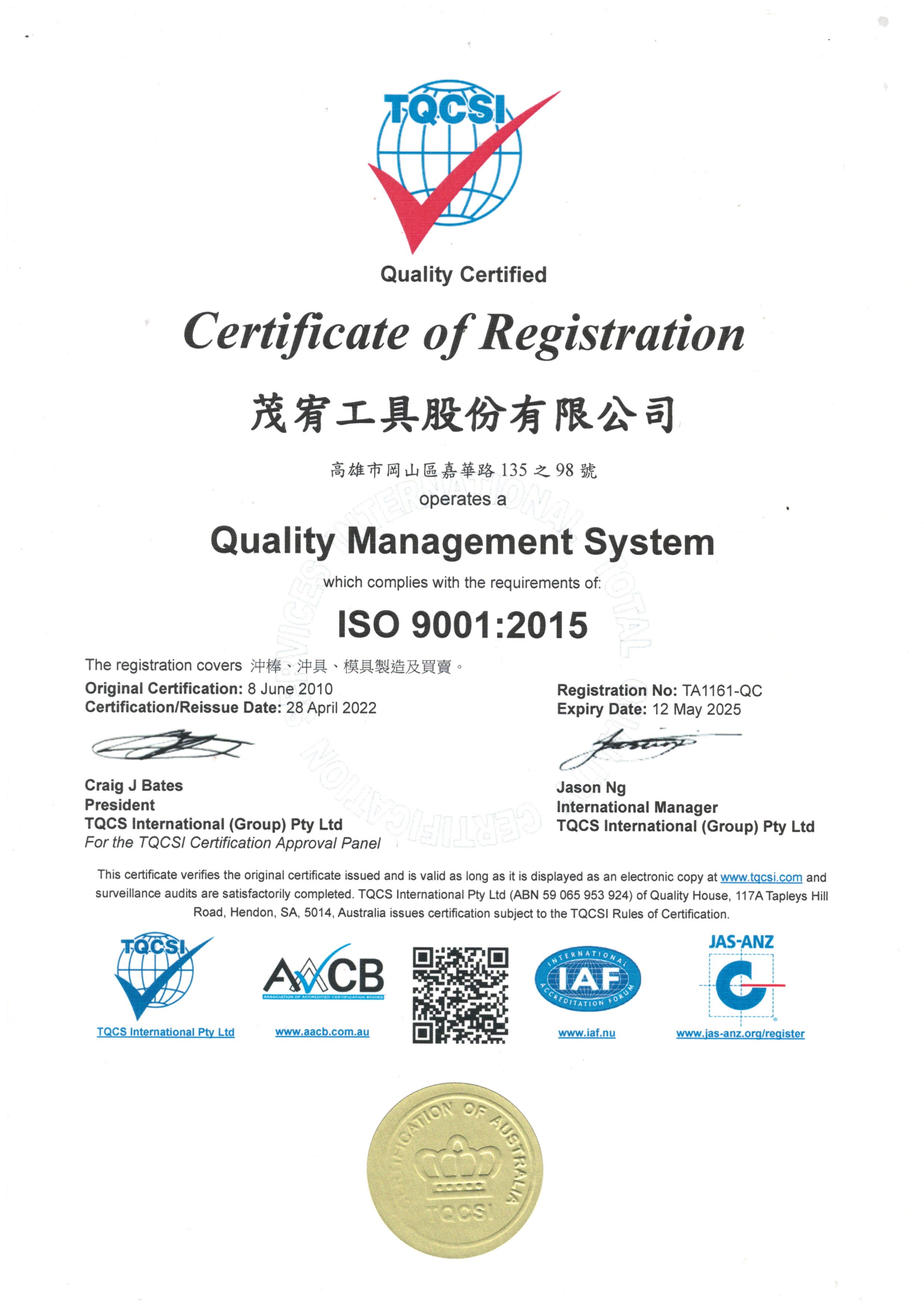茂宥公司成立于西元1988年7月,从事生产各种成型冲棒,锻压成型专用之冲具、零件、工具、量规。